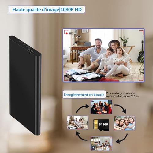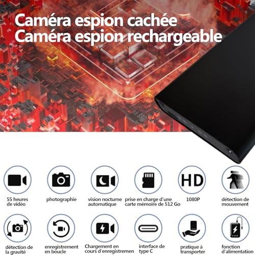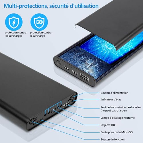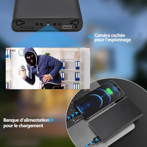 En plus de ses fonctionnalités de caméra, elle sert également comme batterie rechargeable, capable d’alimenter divers appareils électroniques. Son design léger facilite son transport, la rendant idéale pour les déplacements. Deux autocollants sont fournis pour dissimuler l’objectif de la caméra, augmentant encore plus sa discrétion.