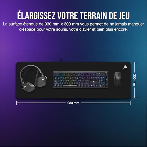 Avec des dimensions de 930 mm x 300 mm, le Corsair MM500 offre un espace généreux pour votre souris, votre clavier et d’autres accessoires. Cette taille est particulièrement avantageuse pour les joueurs qui utilisent des mouvements larges et rapides, permettant une liberté de mouvement sans restriction.
